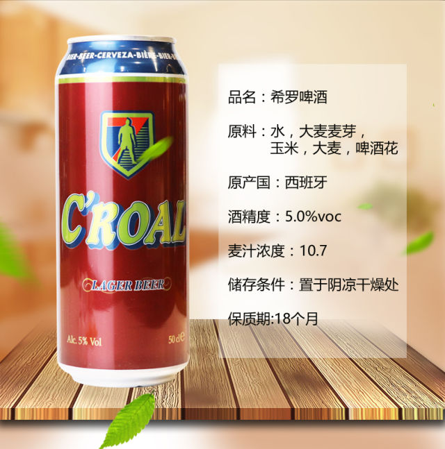 原产国:西班牙 。 原料与辅料:水 、大麦麦芽 、玉米 、大麦 、啤酒花 。 酒精度 :5.0%vol , 原麦汁浓度 :10.7 P 。 贮藏条件:置于阴凉处 。 保质期:18个月 。 限购一箱